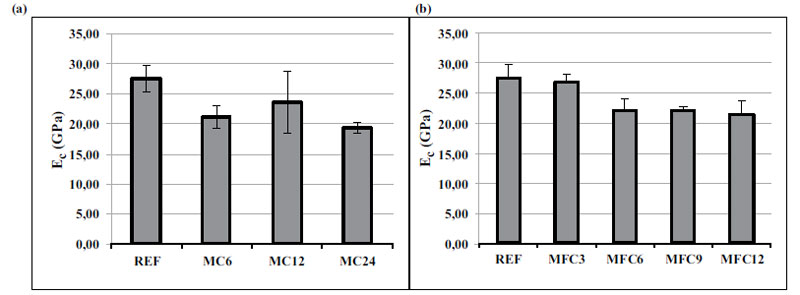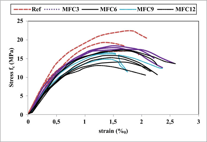 The hardened density follows the same trend as in the fresh state. A decrease of about 1% is noted for the MC24 mixture compared to a non-significant decrease for the MFC mixtures. All the mixes remain within the range of ordinary concretes. The same finding was reported by several authors [10, 45, 46].