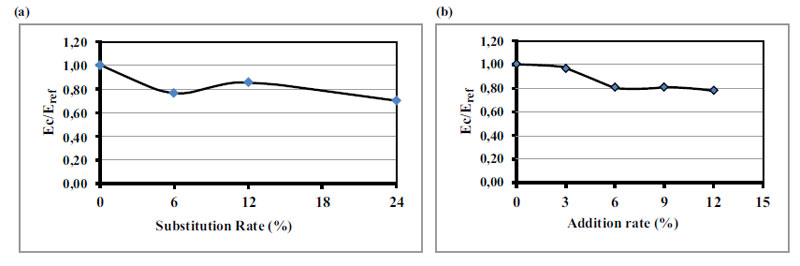 For MC mixes, the compressive strength reduction is in the range of 10 to 31%, corresponding to a strength of 17.46 MPa for MC 12 and 13.44 MPa for MC24. The optimal substitution rate is 12%, corresponding to a reduction in compressive strength of about 10%. These results can be explained by the fact that the high cement substitution rates reduce the amount of cement paste required for aggregate cement bond. Replacing cement at rates below 12% gives a better packing of particles that reduce the internal pores. The filler effect of MP helps to slightly compensate for the decrease in cement amount.