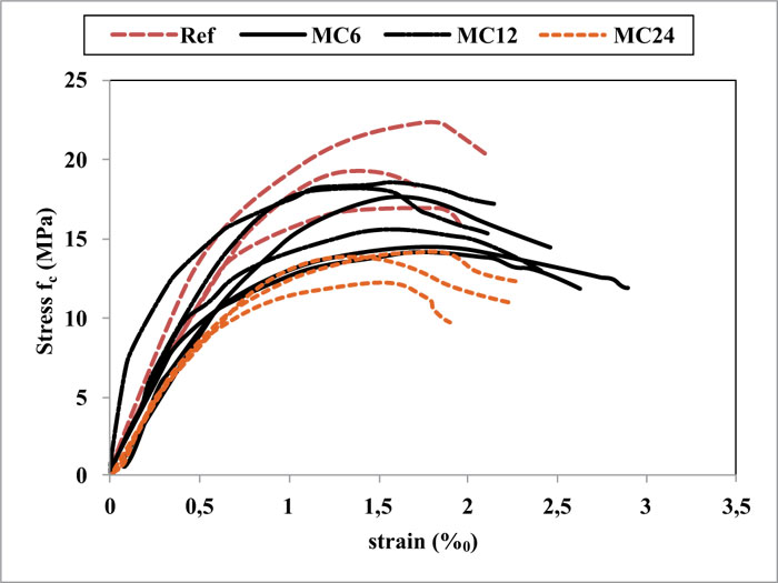 For MC mixtures, there is a decrease in fresh density as the substitution rate increases. A decrease of about 2% is noted for MC24. The lower density of the MP compared with cement explains this result (Table 1). An opposite trend is observed for MFC mixes. An increase in density is noted with the increasing rate of additions. This result is evident because the MP serves as filler within the concrete, increasing the density of the mix. As the densities are higher than 2000 Kg/m3, the formulated mixes are classified as ordinary concretes.