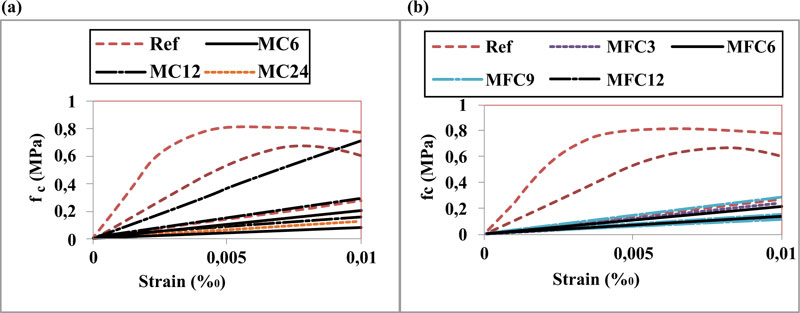 In the case of MFC mixes, the reduction in compressive strength is between 8% for MFC 3 and 21% for MFC12. A significant decrease was noted when MP additions exceeded 3%. With high addition rates, the percentage of aggregates, including MP, is increased and more cement is required to achieve a similar resistance to the reference. Besides, the amount of water added to maintain the W/(C+Filler) ratio equal to 0.61 has increased the W/C ratio, which has contributed to the reduction of the compressive strength. Therefore, it is recommended to keep MP additions below 3% to avoid a considerable drop in compressive strength.