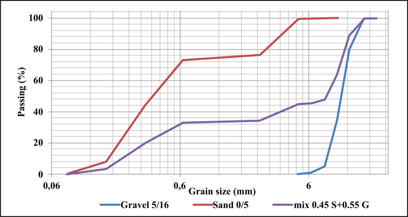 Table 1 shows the physical properties of aggregates. River sand is used with a maximum particle size of 5mm prepared by a combination of two types of sand, 0/2.5mm and 2.5/5mm, with a proportion of 75% and 25%, respectively. The obtained sand has a specific gravity of 2.5 g/cm3 and a fineness modulus of 2.26. Crushed gravel is used with a 5/16 mm size and a specific gravity of 2.73 g/cm3. The particle size distribution of aggregates is given in Fig. (2).
