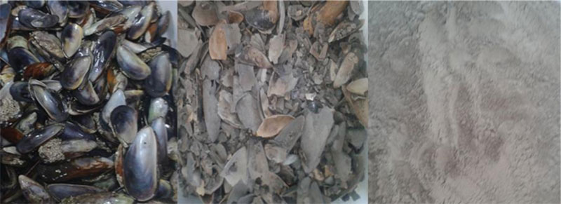 Fig. (4). Appearance of mussel shells before and after treatment and grinding.