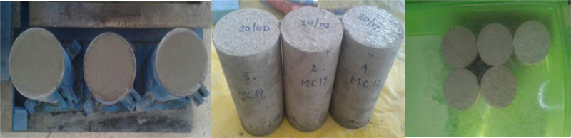 The sampling is carried out according to EN 12350-1 standard [37]. The filling of cylinder molds was carried out in three layers with manual tamping using a tamping rod. Each layer of concrete was tamped 25 times to eliminate air bubbles. Demolding is carried out after 24 hours. The specimens were kept in a water container until the day of the test, as required by the standard EN 12390-2 [38] (Fig. 5).