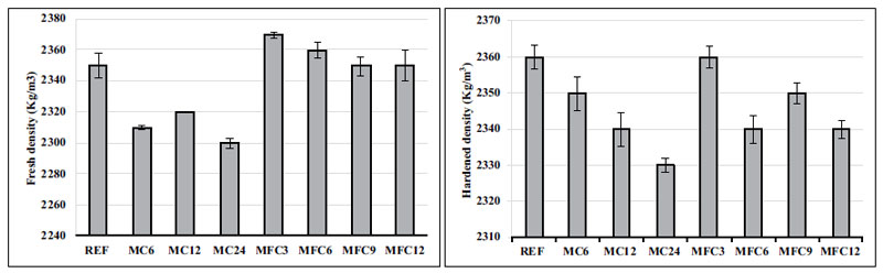 Fig. (7). Fresh and hardened density of MC and MFC composites.