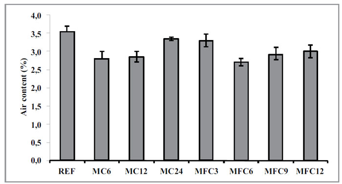 The air content was determined using the pressure method according to the EN 12350-7 standard [40]. Fig. (8) shows the air content in percentage for MC and MFC mixtures.