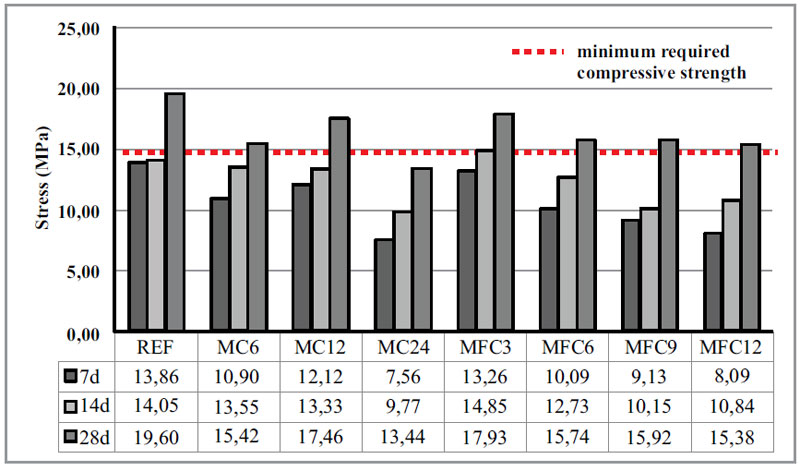 As expected, there is an increase in compressive strength with the sample age. The average strength of the reference concrete achieved the target strength in the formulation process (≈20 MPA). A decrease in compressive strength is noted for the MC and MFC mixes compared to the reference concrete. Nevertheless, the majority of mixes have achieved the minimum required strength for non-structural concrete (about 15MPa) except for the MC24 mix.