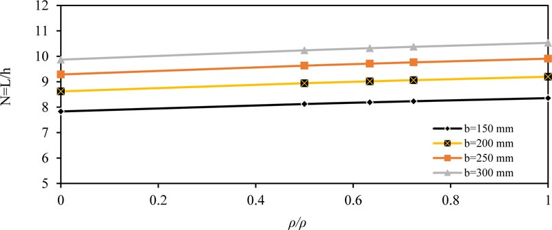 - The span-depth ratio (N = L / h) decreased with increasing the applied load, or in other words, the required depth increased with increasing the applied load for all values of concrete strength and beam width.