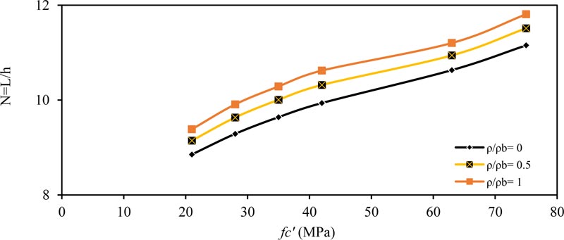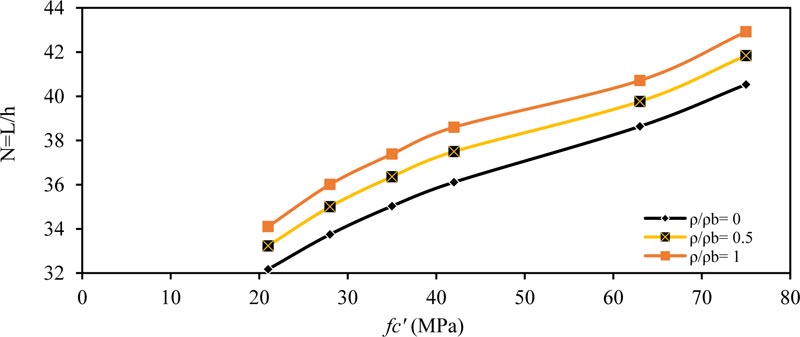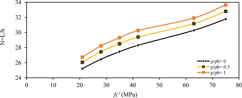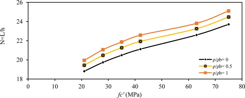 - The effect of the reinforced indicia ratio (ρ/ρb) is small on the span-depth ratio (N = L / h) for all values of applied load and concrete compressive strength.