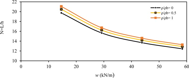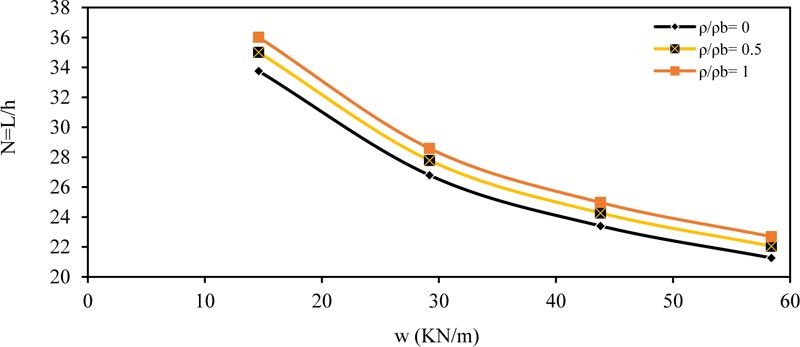 Fig. (2) shows the effect of the applied load (w) on the ratio (N) for simply supported beam. As shown, the value of (N) decreased with increasing the applied load (w); this means that the required depth increased with increasing the applied load value. The same conclusions were obtained for other values of (ρ / ρb = 0, 0.5 and 1.0). Also the behavior was same for other values of (ƒ'c and b).