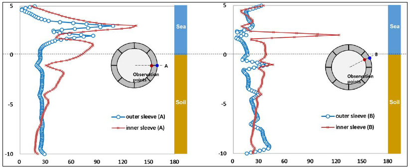 Thus, the magnitude of suction is the most important design factor of the bottom segment. Unexpectedly, the upper part of the outer sleeve had low stress irrespective of the contact condition. This means that the effects of wave pressure with the tidal current are small and could be ignored in the installation stage.
