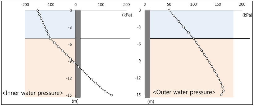 Through the above analyses, our results show that the stresses rapidly disappear along the different heights, direct changes in water pressure due to suction are a main design load factor of the cofferdam, and stress profile patterns are similar to models with suction pressures of 100 kPa and 150 kPa. If the bearing capacity of the seabed is small, the cofferdam behaviours can be governed by other external loading factors and water pressure change due to seepage is overall linear. Although nonlinear seepage effects appear near the skirt tip, this area is small and can be ignored. The application of water pressure due to seepage causes significant changes in stress profile patterns of the inner sleeve. Seepage effects should be considered for the basic design of the cofferdam and examination of contact effects is recommended as part of the design detail.