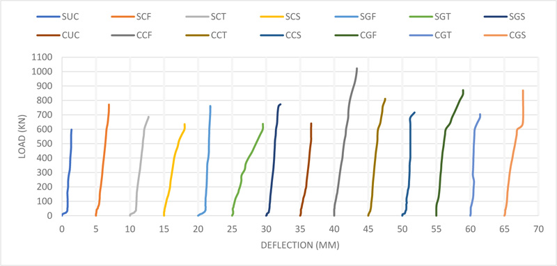 Fig. (2) indicates the load-deflection curves at the mid-height of every column specimen. The load deflection relationship for a column is important for pointing out the behavior of the loaded column. Generally, two main stages in behavior are noticed for unstrengthen columns. An initial linear slope, corresponding to the un-cracked stage of the column, is noted. When the cracking load is completed, the change in slope is detected, owing to the progressive cracking of the columns until failure.
