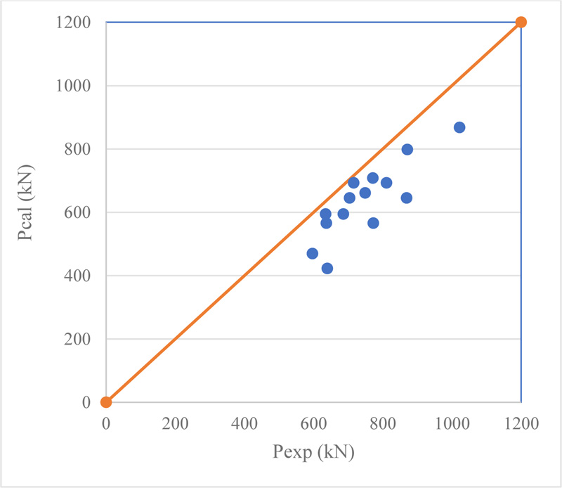 The axial compression strength was calculated based on the proposed equation in ACI ACI 440.2R-02 for strengthened columns and ACI 318 for unconfined columns and compared with the test results obtained in the experimental works for this study. As seen in Fig. (5), most of the points are near the diagonal, at the lower bound; these results show that the method is safe, especially for specimens that confined by glass FRP sheets spirally (samples CGS and SGS having Pexp/ Pcal 1.35 and 1.37 respectively), as shown in see table 5