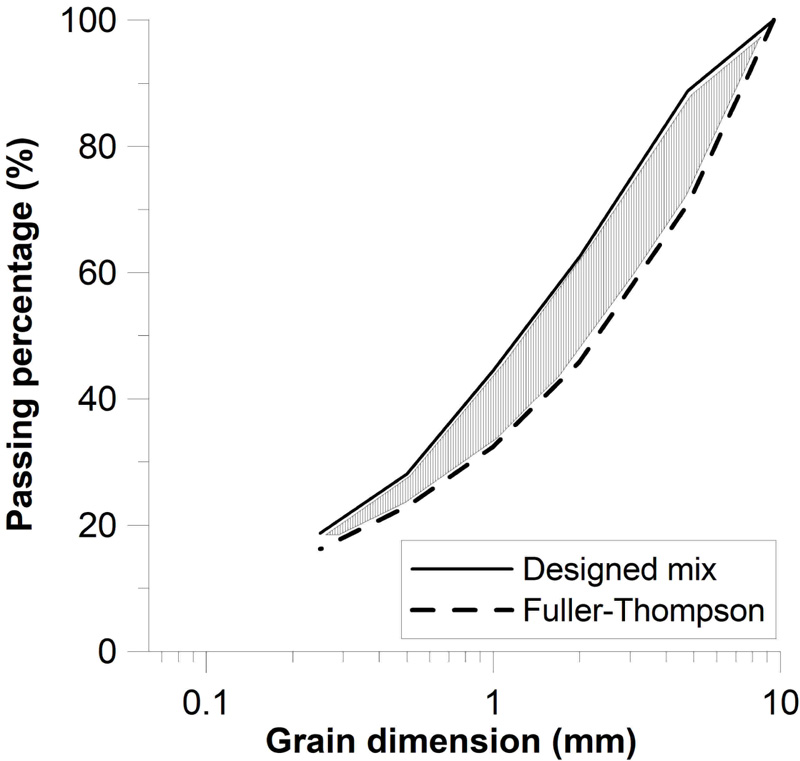 The finer fraction was added to facilitate the sliding at the interface between the larger grains and, therefore, to confer greater workability. From preliminary tests, in fact, in the absence of the very fine fraction, the workability of the mixture was not acceptable. The aggregates were used in the dry state. The water content also includes the part needed to wet the aggregates.
