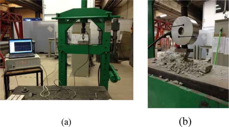 The uniaxial compressive strength Rc was obtained, as prescribed by the standard UNI EN 1015-11, by applying the load at a constant rate on the half prism obtained by the bending failure. The instrumental test apparatus was identical to that of the flexural test, as it is shown in Fig. (4b). The compressive strength value was obtained from the maximum applied load Fc as:
