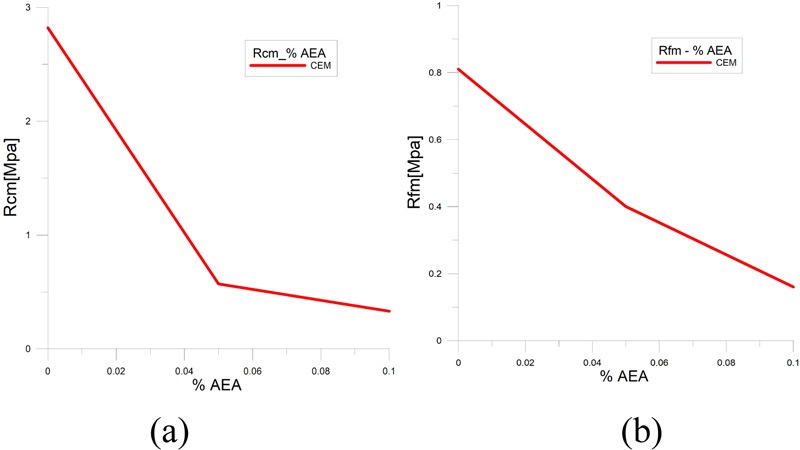 The compressive strength Rc shows a decrease from 2.82 to about 0.57 MPa, for AEA ranging from 0 to 0.05%, so with a reduction of about 80% and a gradient of 45%. Rc is about 0.33 MPa for AEA of 0.1% with a reduction of 42% with respect to the case of AEA equal to 0.05% and a gradient of 4.4% for AEA higher than 0.05%. The flexural strength Rf shows a decrease from 0.81 to about 0.4 MPa, for AEA ranging from 0 to 0.05%, so with a reduction of about 50% and a gradient of 8%. Rf is about 0.16 MPa for AEA of 0.1% with a reduction of 60% with respect to the case of AEA equal to 0.05% and a gradient of 5% for AEA higher than 0.05.