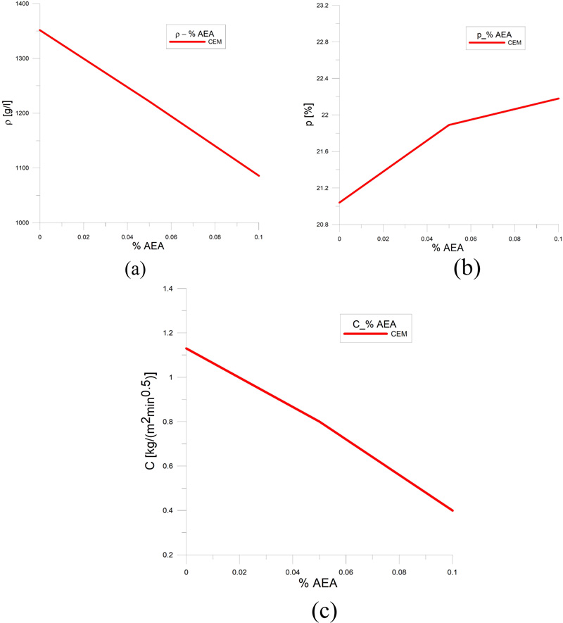 With regard to the density, a continuous linear decrease was observed as the AEA increases. A similar behavior shows the water absorption, which shows a smooth variation in the gradient in correspondence with the percentage of AEA being 0.05%. Otherwise, as expected, the porosity increases with the increase of the AEA; once again a variation in the gradient is observed for AEA of 0.05%.