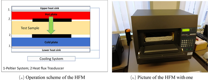 The equipment consists of two plates that are heated and cooled through the thermoelectric effect. The temperature difference generates a heat flux between the top and bottom plate until a steady-state condition is observed. Thus, the thermal conductivity is calculated according to Fourier’s Law. The overall accuracy of the instrument is within 3% that remains stable for several days, thus providing excellent repeatability. The Heat Flow Meter HFM 436 Lambda is able to hold specimens with a maximum size of 300 x 300 mm and a maximum thickness of 10 cm, so the samples have to comply with this constraint. Fig. (7) shows the operation scheme and a picture of the HFM with one of the samples studied.