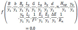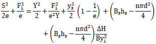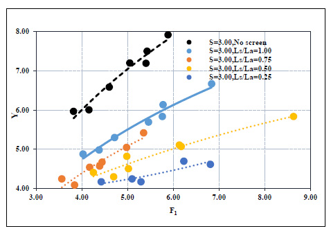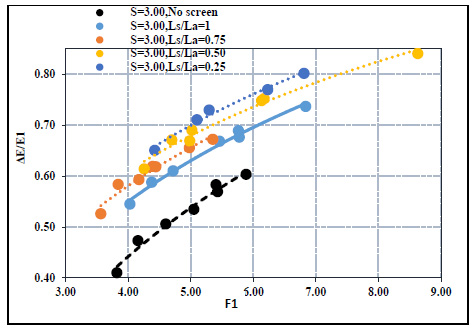 1/F2 is replaced by F2, from (B/y1) and (b/y1) yielded to B/b=e. From (Bs/y1) and (b/y1) we get the relative screen width (Bs/b). The hydraulic jump efficiency =E2/E1 may be calculated using (E 2/y 1) and (E 1/y 1). Subtract E2/E1 from unity (1-E2/E1) = (E1- E2)/ E1=ΔE/ E1, the relative energy loss through the hydraulic jump. From Bs/y1, hs/y1, d2/y12 we can get (y1/Bs*y1/hs*d2/y12)=d2/Bshs=nπd2/As=Aholes/Ascreen, from (Ls/y1) and (Lb/y1) we obtained Ls/y1* y1/Lb = Ls/Lb the relative length of the screen. When the screen height, screen area and the expansion ratio were constants through this study;