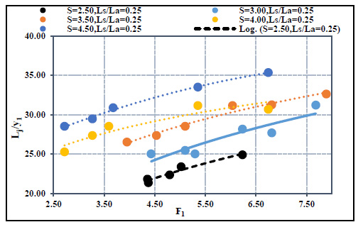 Fig. (11). Relation between F1 and Lj/y1 for ls/la = 0.25 at different submergence ratios.