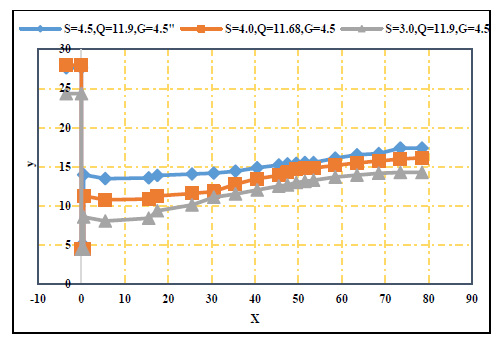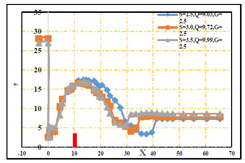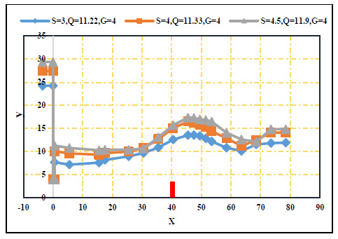 The water surface profiles of the submerged hydraulic jump were plotted to show the effect of the screen location. The water surface profile for the case of no screen and with a screen at 10 cm from the gate was presented in Figs. (10 and 11), respectively, as representative examples. From these figures, the changes in the water depths in the case of no screen were gentile and smooth. The expansion in the vertical direction (i.e., the water depths) needed an extra length compared to the case with a screen at any location under the same flow conditions. The flow jet impacted the screen. Consequently, it generated a reverse flow and raised the water surface over the screen. When the screen was located far away from the gate, the fluctuation of water depths around the screen decreased for all the submergence ratios, as shown in Fig. (12).