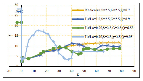 The relative energy loss decreased when the screen was fixed far away from the gate. For example, at F1=5.00 and S= 4.5, the decreasing percentages were 29.41%, 27.45%, 21.57% and 17.65% when the screen was fixed at the relative distances 0.25, 0.5, 0.75 and 1.00, respectively, compared to the no screen case. While, at S= 2.5, the increasing percentages of the relative energy loss for the same previously mentioned screen locations were 30.91, 25.45, 23.64 and 17.27, respectively. The decreasing percentages of the relative depth of the hydraulic jump were 35.8%, 34.37%, 26.01 and 20.05% at the relative distances 0.25, 0.5, 0.75 and 1.00, respectively, compared to the case of no screen at F1=4.50 and S= 4.5. However, in the case of S=2.50, the decreasing percentages of the relative hydraulic jump depth were 44.86, 41.84, 36.56 and 29.76 for the (ls/la) = 0.25, 0.50, 0.75 and 1.00, respectively. As well, for example, at F1=5 and S= 4.5, the decreasing percentages of the relative length were 35.40%, 34.20%, 26.00 and 19.60% at the relative distances of 0.25, 0.5, 0.75 and 1.00, respectively, compared to the case of no screen. Furthermore, at S=2.50 the decreasing percentages of the relative length of the hydraulic jump were 43.59, 40.26, 35.90 and 28.21 for (ls/la) =0.25, 0.5, 0.75 and 1.00, respectively.