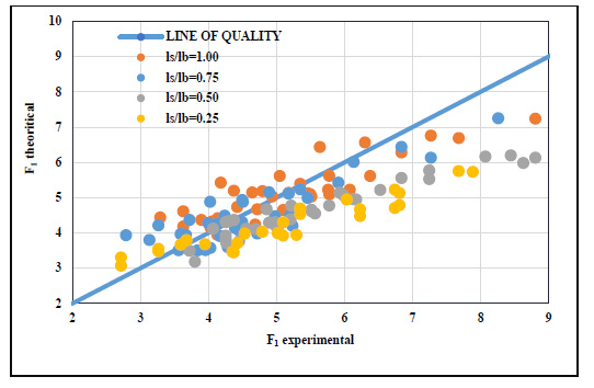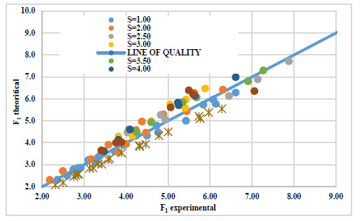 The relation between the theoretical and experimental Froude numbers for the perfect hydraulic jump (i.e.,S=1.00) matched closely, as shown in Fig. (8). In this Figure, the equation’s results of Hager (1985) [24] were below the estimated results of the present study. This difference can be attributed to the assumption of a curved linear dead zone (separation zone) downstream the sudden expansion instead of the abrupt expansion done by Hager (1985) [24]. Moreover, Hager (1985) assumed that the separation zone was a smooth solid boundary [24]. This hypothesis simplified the problem and caused the acceptable errors in the theoretical Froude number of Hager (1985) [24]. The deviation of the theoretical results of this study around the line of quality increased positively with the increase of the submergence ratio. Rajaratnam (1965) concluded that the submerged hydraulic jump jet decreased the mixing between forward and backward flow, especially at the higher submergence ratios [1]. Moreover, the occurrence of the asymmetric flow below the sudden expansion caused a remarkable change in the lateral water depths downstream the abrupt expansion. Consequently, the hypotheses of pressure linear distribution through the jump are affected by the higher submergence ratio and the asymmetric flow conditions (Figs. 9-11).