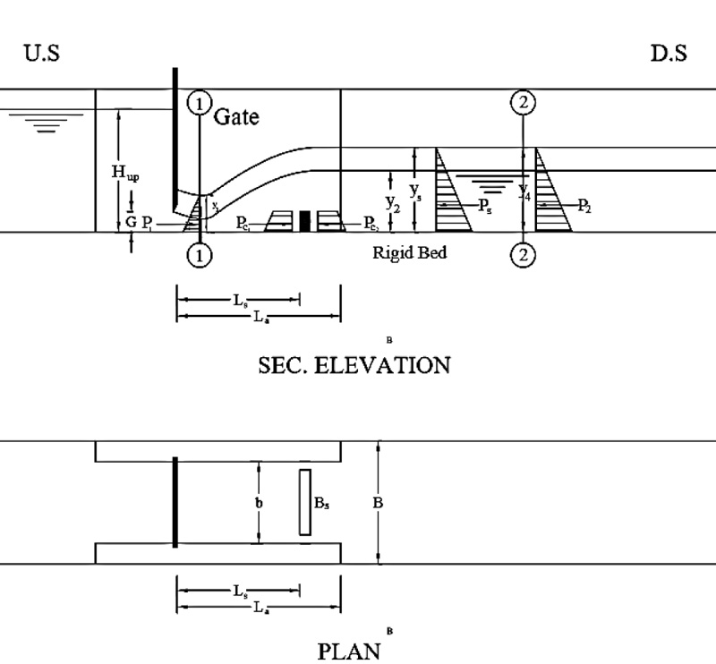 To create a theoretical model for calculating the relative depth of the submerged hydraulic jump, the pressure–momentum relationship between sections 1-1and 2-2 have been applied.
