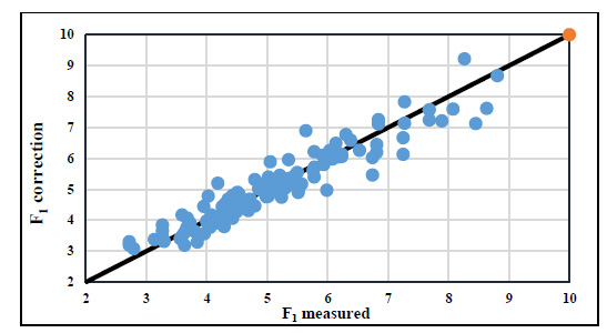 Fig. (8). The relation between the theoretical and experimental Froude numbers derived from Eq. no. (15).
