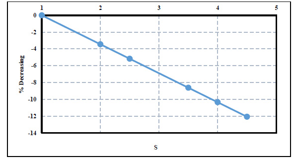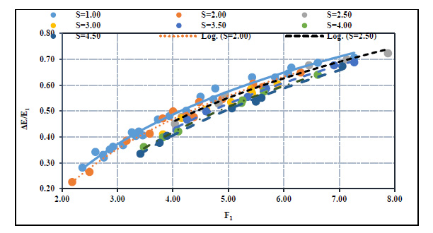 Fig. (3) shows the relation of the initial Froude number (F1) and the relative energy loss (ΔE/E1) for different submergence ratios. The relative energy loss increased as the Froude number increased for all submergence ratios. Moreover, the relative energy loss decreased as the submergence ratio increased at a specific Froude number. Fig. (4) shows the decreasing percentage of the relative energy loss due to the increase in the submergence ratio at F1=5.00. The percentage of decrease rose when the submergence ratio was increased e.g., at F1=5.00, the relative energy loss decreased by 12% roughly for the submergence ratio S=4.50 with respect to S=1.00. It was also found that the decreasing percentage of the relative energy loss decreased linearly with the submergence ratio.