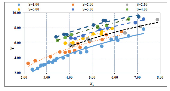 Figs. (5 and 6) show the relation between the initial Froude number and the relative depth of the hydraulic jump (Y) and the relative length of jump (Lj/y1), respectively. From these figures, as the Froude number increased, the relative depth of the submerged hydraulic jump and the relative length of the hydraulic jump increased for any submergence ratio. For a certain value of an initial Froude number, the relative depth and the relative length of the hydraulic jump increased with the increase of the submergence ratio. The increasing percentage of the relative depth and length of the hydraulic jump also has a linear increasing trend, as shown in Fig. (7). In other words, for a given submergence ratio, the increasing percentage of the depth and length of the hydraulic jump has a nearly constant slope.