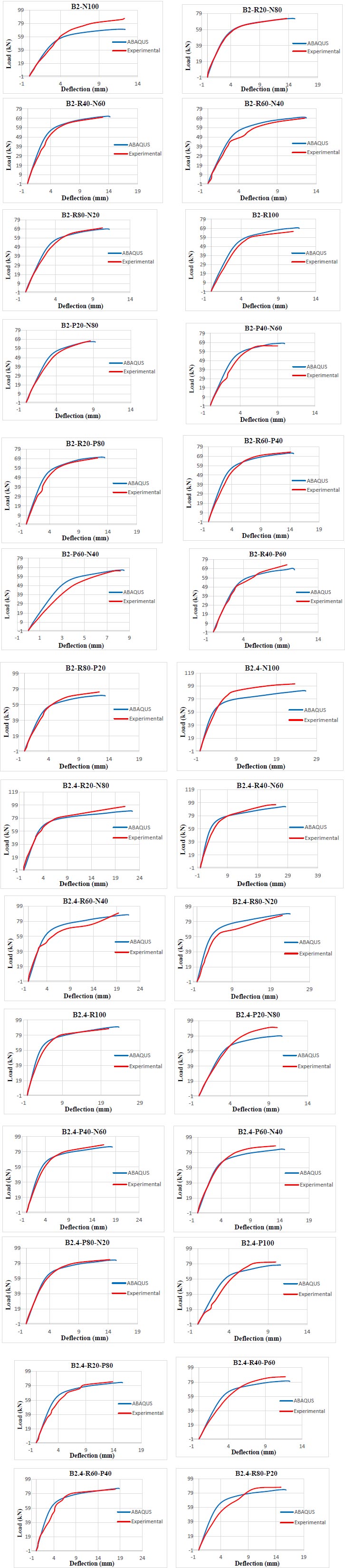 The load-deflection behavior obtained from Abaqus was also compared with the experimental behavior of all beams and the results are illustrated in Fig. (14).