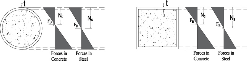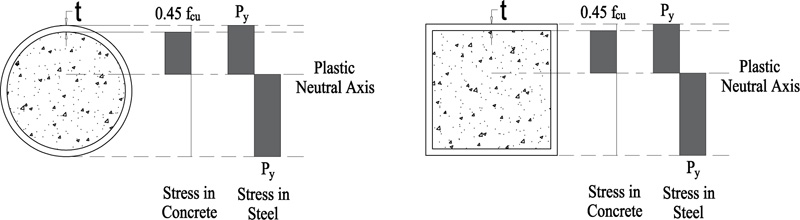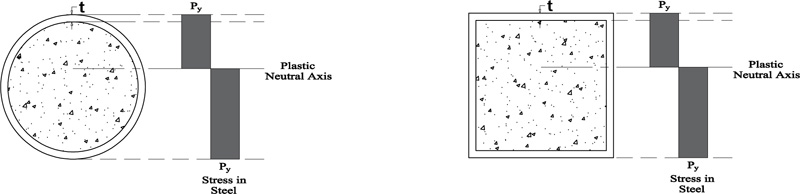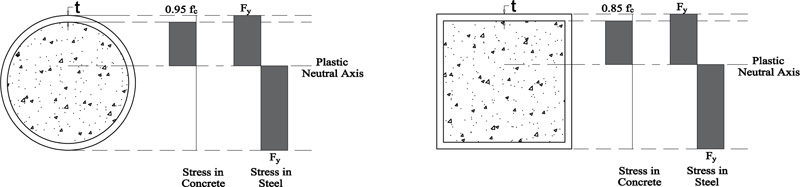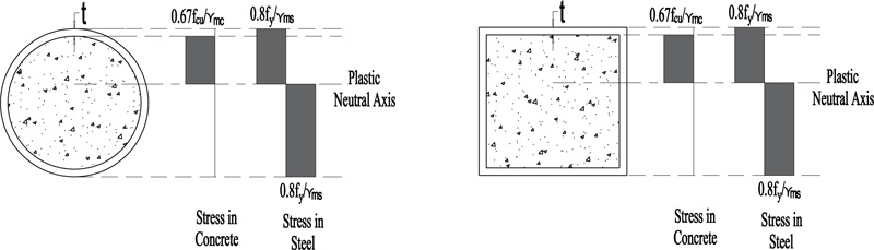 The steel is assumed to reach its yield stress (Fy) in tension and compression, and the concrete in compression is stressed to 0.85f'c due to axial force or flexure, where f'c is the specified compressive strength of concrete. For round hollow structural steel (HSS), concrete, compression stress of 0.95f'c can be used because of concrete confinement. Fig. (3) provides an illustration of the stress distribution according to PSDM method.