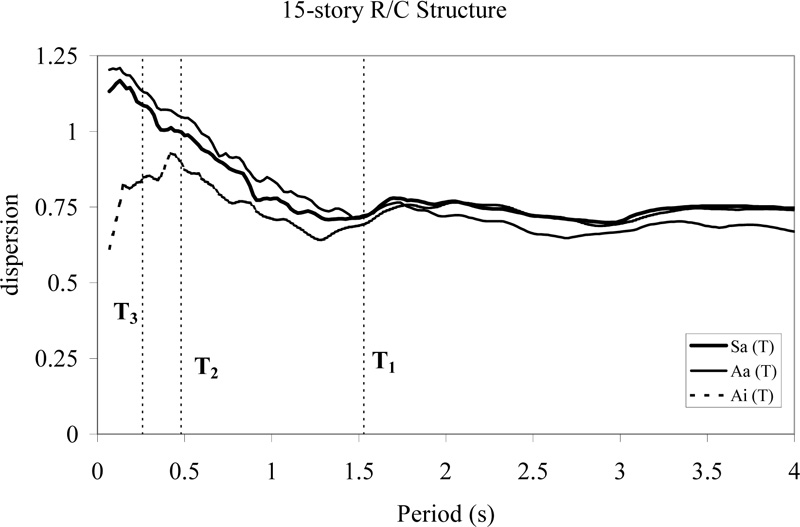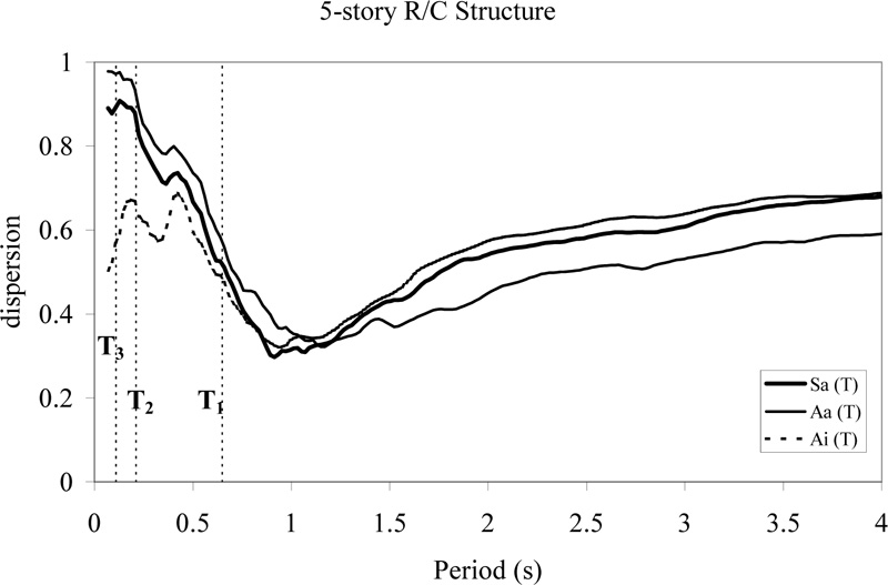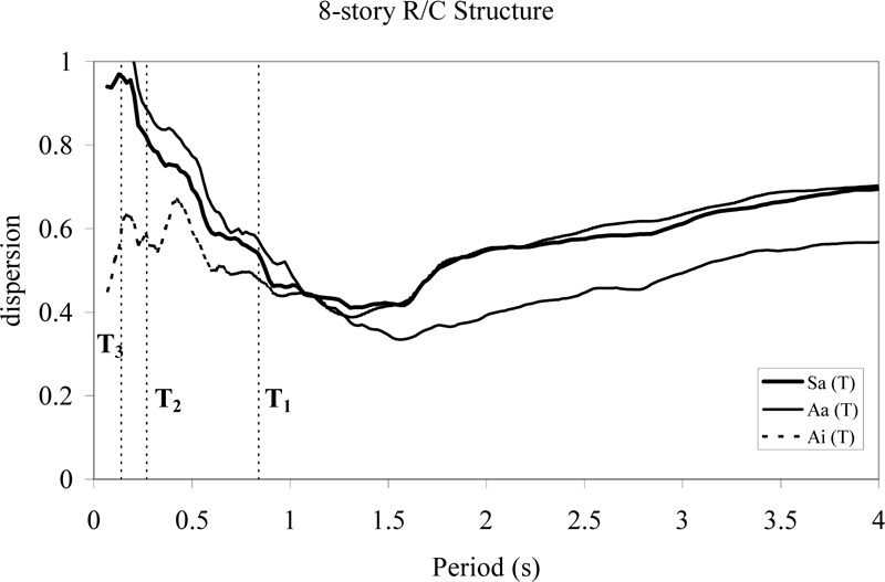 When all the Figs. (7-10) are studied, it is found that generally, Ai yields the smallest dispersion for short periods and Aa yields the smallest dispersion for long periods. The results suggest that the choice of the most efficient GMP and associated optimal period will depend on the type of structure, the participation of the various modes, and the degree of inelastic behavior that is expected.
