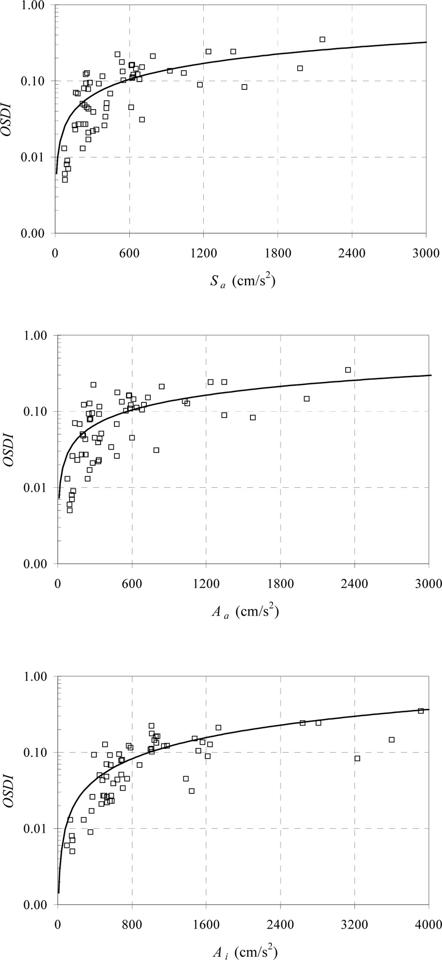 The power-law model in Equation 4 is employed together with damage measure, OSDI, for the R/C structures and with the three GMP alternatives. In regression studies of this type, a lower standard deviation (dispersion) of the damage measure given the value of the GMP will be considered a better indication of correlation between that damage measure and the corresponding GMP.