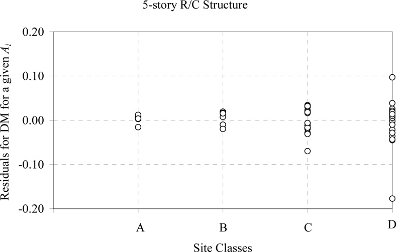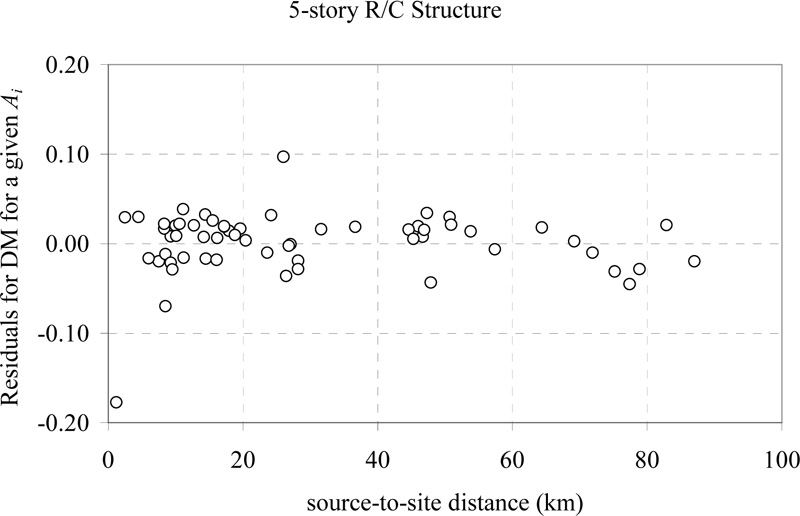 Since Ai was the most efficient GMPs for the R/C structures, we investigated the sufficiency of this GMP next. The variation of the residuals from the regression with various source and site characteristics for the steel structures is studied next. Results are presented only for the 5-story R/C structure in Figs. (4-6) because findings are similar for the other R/C structures. No significant trends are seen again; the mean of the residuals is very close to zero with variation in each source/site measure. Dispersion in the residuals is again seen to be slightly larger at large magnitudes and for softer soil sites, but this might be because of the non-uniform data with each source/site measure.