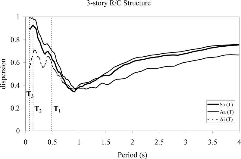 Dispersion values for the 3-, 5-, 8-, and 15-story R/C structures are plotted in Figs. (7-10), respectively. The optimal periods to be used with each GMP correspond to the periods where the dispersion is smallest. In order to make clear where these optimal periods lie relative to the natural periods of the structure in question, the first three modal periods are shown in Figs. (7-10).
