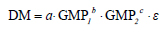 where, a, b, and c are coefficients estimated in the regression and, as before, ε is a term describing the dispersion in the power-law relationship.
