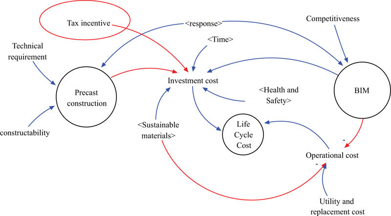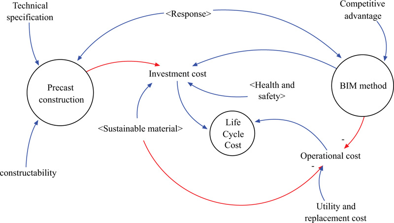 The system consisted of several subsystems, where each subsystem was controlled by some variables from specific criteria (Fig. 1). For example, the application of lean construction resulted in additional investment costs and reduced operating costs. Finally, the LCC will influence the adoption of lean construction to reduce the impacts and create a close loop. The significant variables and the interaction among them are reflected in a CLD.
