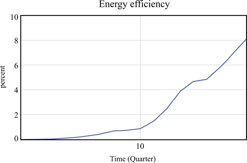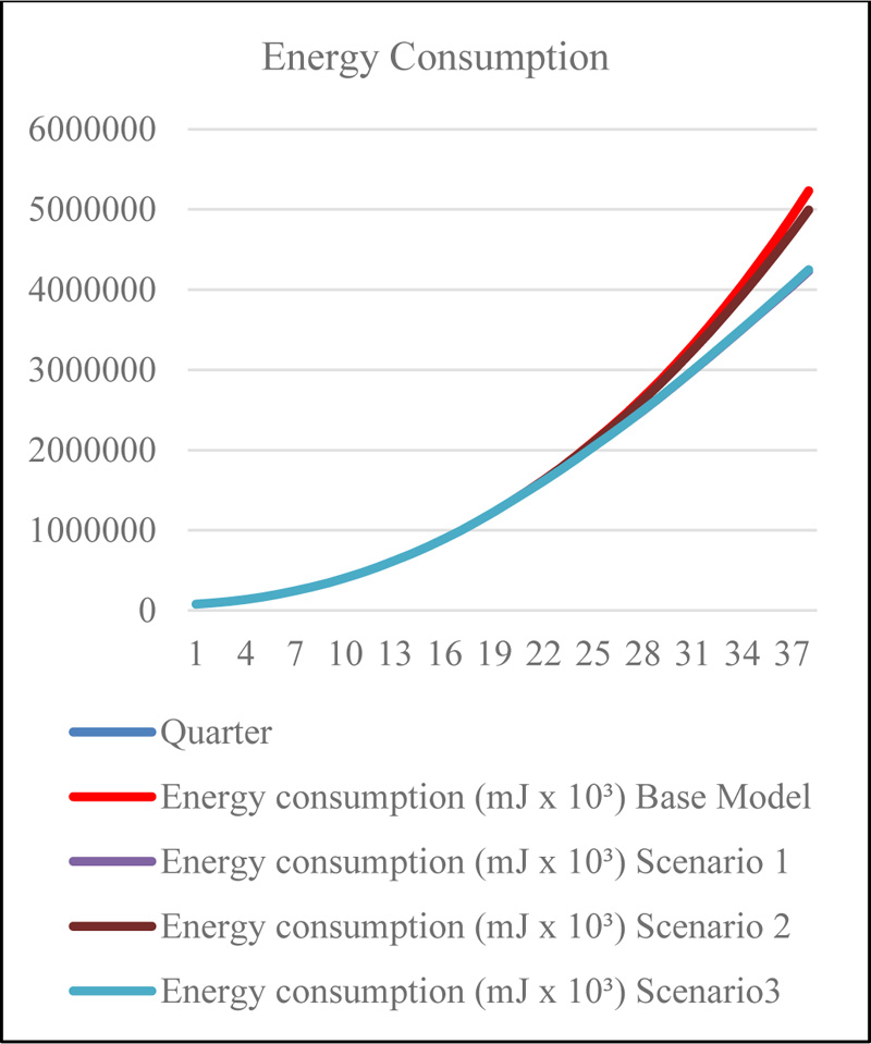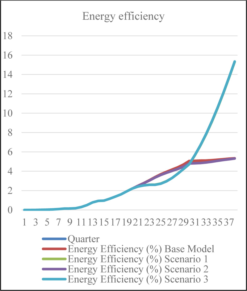 Scenario 3 was designed by combining the influence of energy performance regulation and tax incentive policy. It was expected that the mixed policies would generate better outcomes of energy savings compared to individual ones without sacrificing the economic objectives of the project [43]. The simulation results of the base model after applying the scenarios on energy consumption, energy efficiency, and life cycle cost are shown in Figs. (11-13), respectively. The time interval is a quarter year.