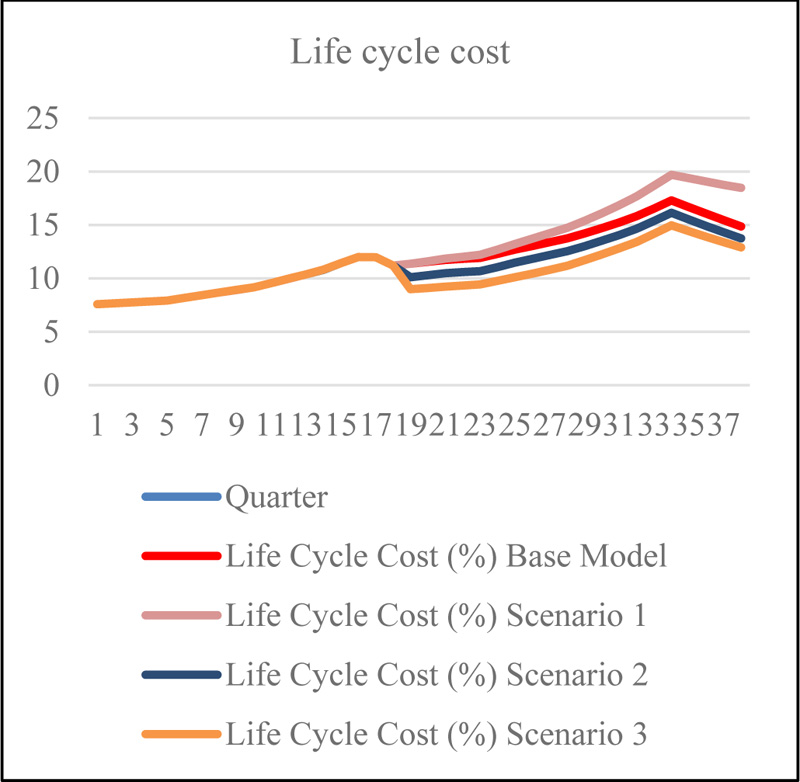 The life cycle cost variable represents the total cost required during the project life cycle, including the initial cost and operational cost incurred by the implementation of the regulations and sustainable construction methods (Fig. 8). The result indicated that the impact of regulation and sustainability practices on the LCC is not significant, whereas the LCC still increased up to 12% due to the project growth.