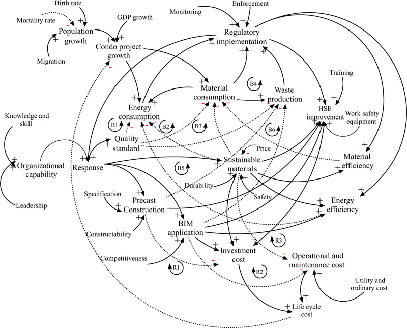 Conversely, some loops were reinforcing. Take loop R1, for instance. High-rise development growth requires larger amounts of construction materials that need to be controlled by the government through regulations to minimize resource depletion. Implementing regulation required the adoption of sustainable practices such as precast construction. The application of precast construction will reduce the investment cost because of efficient material use and better control of components produced in the factories. The decrease in the investment cost will reduce the LCC, which positively impacts the affordability of the project to meet housing demand. A similar pattern is also seen in loops R2 and R3.