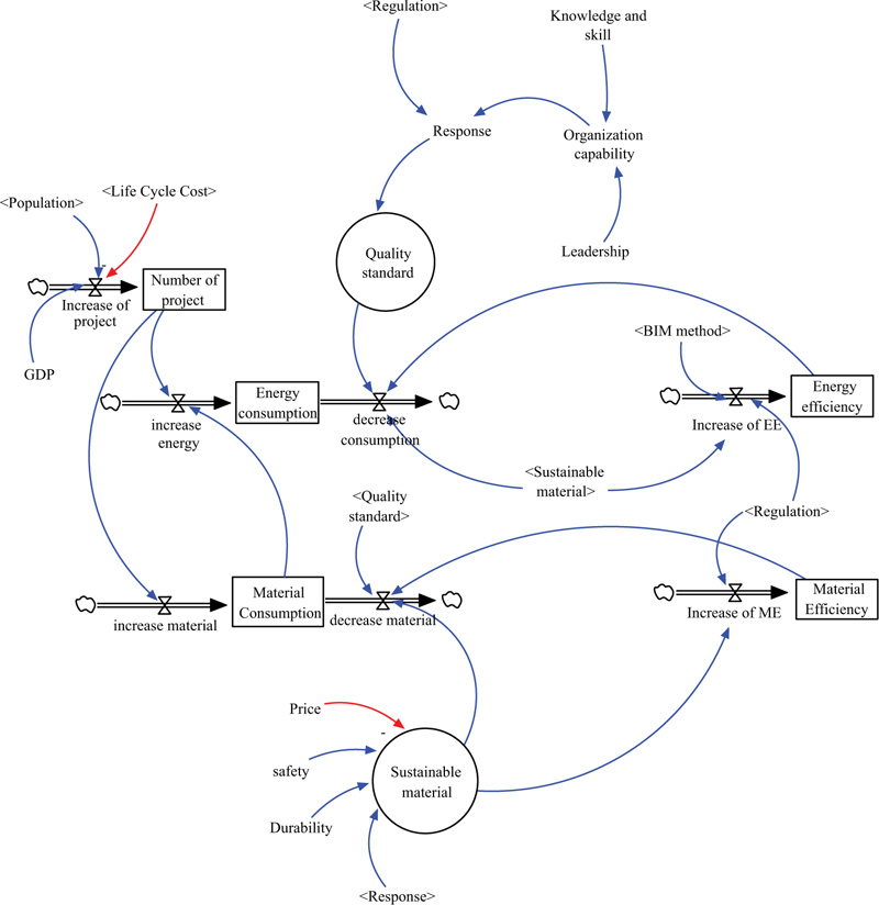 Based on the boundary chart, a dynamic hypothesis of sustainable construction for high-rise residential projects was defined and represented by a CLD, describing the interrelationship of the variables which created the system behaviour (Fig. 2).