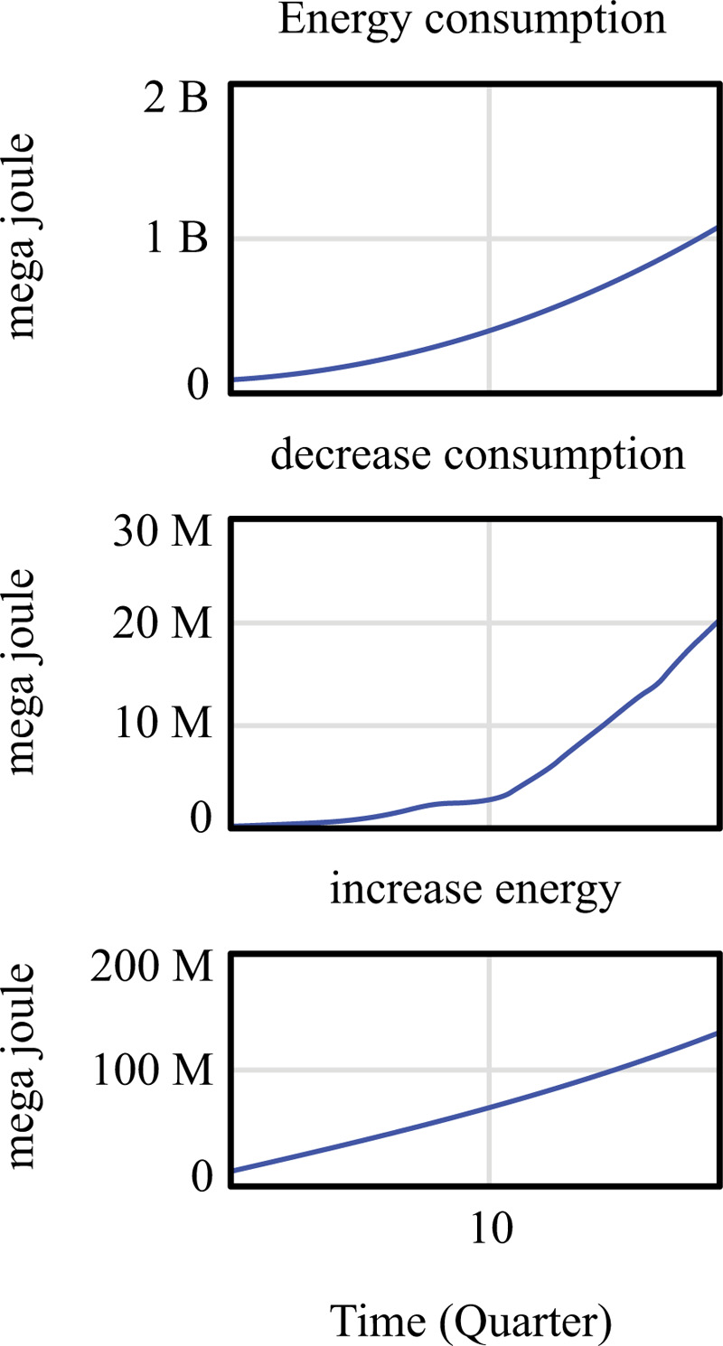 Before conducting the model simulation, it is important to verify the model and check the model's validity. Verification is the process of ensuring whether a simulation computer program works as intended, while model validation is a tool to ensure the accuracy of the conceptual model to represent the actual environmental problem being studied [31]. Verification is a test to detect and report any error in the model. If there is no error, then the model is working in conformance with the system logic. The verification result of the model showed that there was no error, and the model development met the validated requirement. A validity test is an instrument to check the possibilities of two types of statistical errors. If Type I error (E2) occurs, a hypothesis is true but falsely rejected. If a Type II error (E2) occurs, a false hypothesis is falsely accepted. E1 is identified through statistical mean comparison, while E2 can be detected through amplitude comparison. Barlas defined that a model is valid when E1 value <5% and E2 value < 30% [37]. In this paper, the validity test result of energy consumption revealed that E1 is 3% and E2 is 3%, so the model was valid, as shown in Table 3 and Fig. (5). Similar results were also seen in material consumption and waste production variables. The tests confirmed that there were no data errors, and the model was valid.