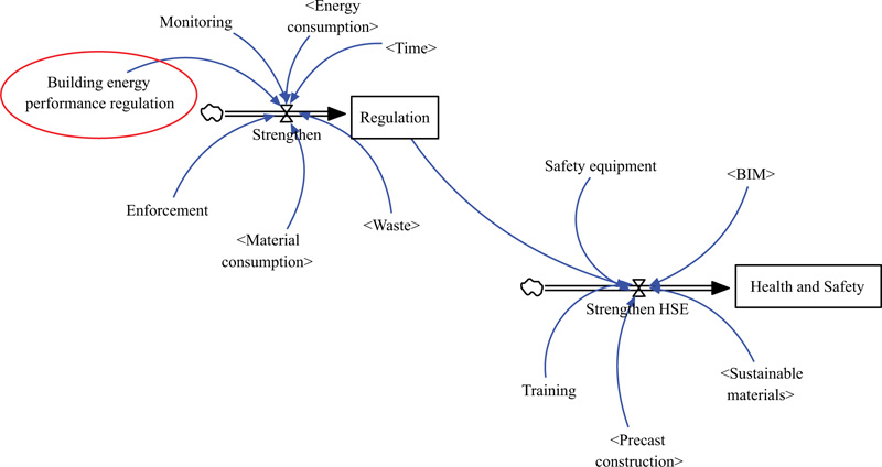 To explain the subsystem mechanism, consider negative loop B1 as an example. The increase in energy consumption resulting from high-rise residential development requires the legislation of environmental regulation to control the negative impact on the environment. The implementation of regulations coerced the organizations to impose a quality standard to minimize defects and repeated work. This standard is expected to reduce the rate of energy consumption. Similar patterns and logic are also found in the rest of the negative feedback loops.