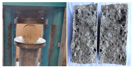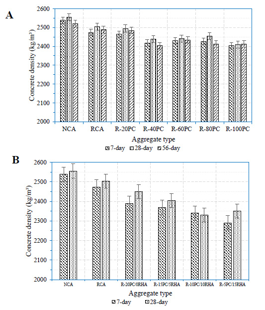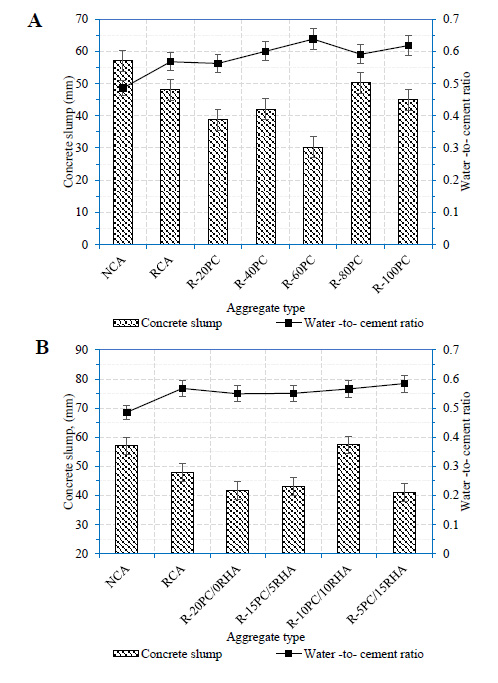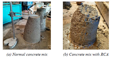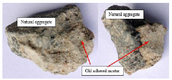 The aggregates were composed of natural aggregate with attached surface mortar, as shown in Fig. (4). RCA had a larger absorptive capacity and lower bulk density compared to natural coarse aggregates. The presence of an adhering mortar on the surface of RCA is responsible for these outcomes. The natural coarse aggregate had the lowest water absorption and the highest bulk density since there was no adhering mortar, as in the case of RCA (see Fig. 4).