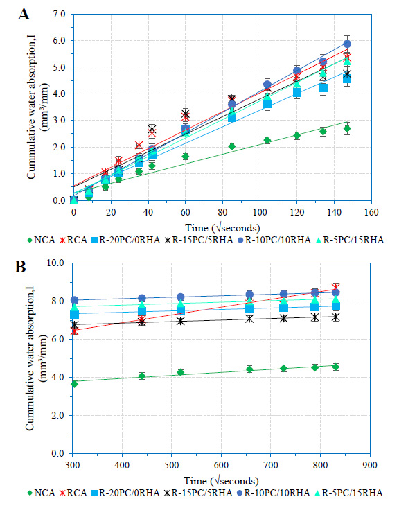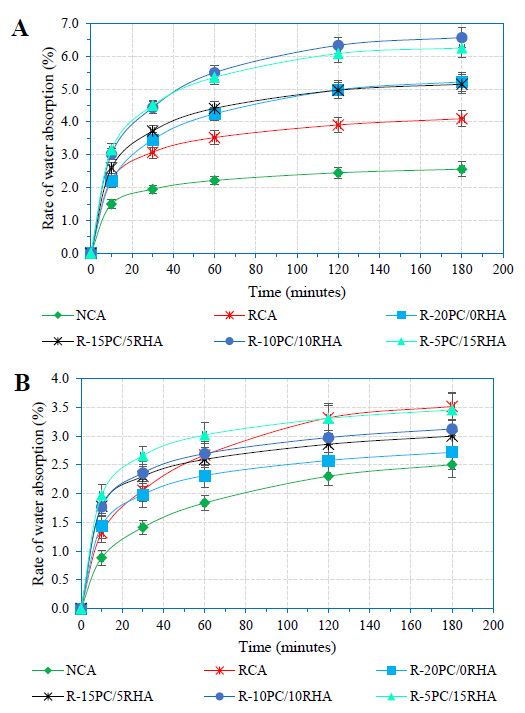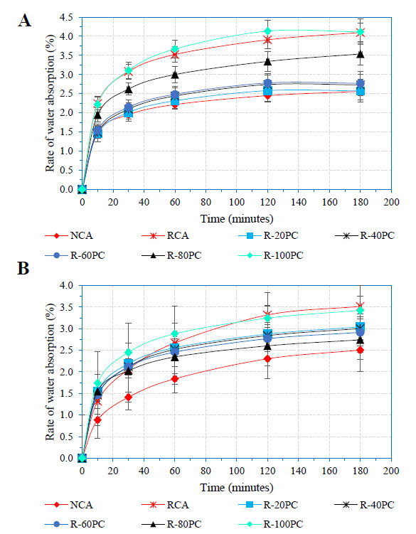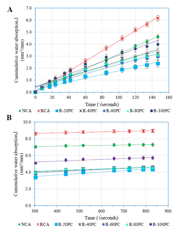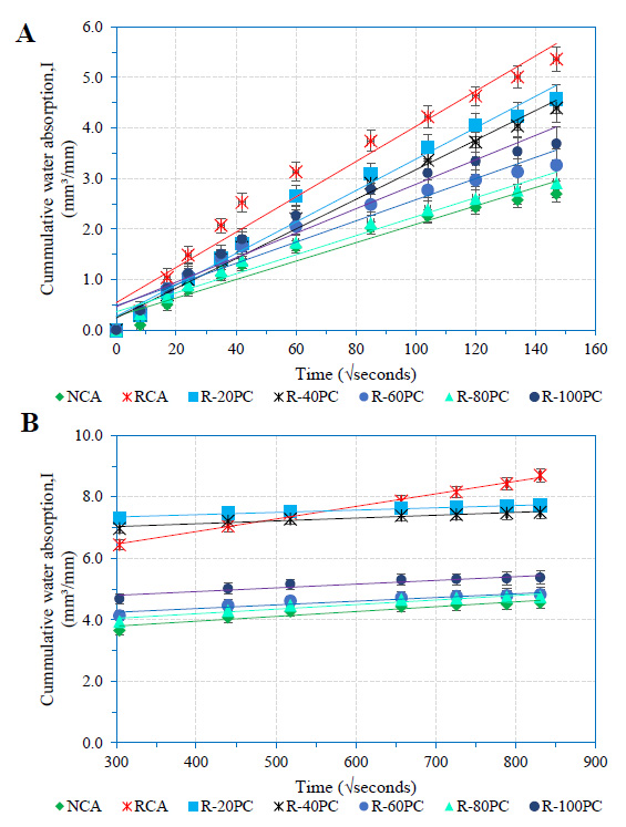 Water penetration is a key component in the durability of concrete as it carries deleterious agents, such as chloride and sulphate, into the matrix of a cement-based material. Infact, the main cause of the difference in the rate of water movement between RCA and natural aggregate is the old mortar attached to recycled aggregate [22]. The study by Liu et al. [22] further demonstrated that the volatility and water penetration in concrete is a direct function of the proportion of RCA in concrete. Goracci, Monasterio, Jansson, & Cerveny [23] noted that the movement of water at different time scales in concrete depends on the pore size and networks. Similarly, a study by Olorunsogo & Padayachee [24] demonstrated that water sorptivity of concrete depends on the proportions of and curing age of concrete with recycled aggregate (RA). The study observed sorptivity reductions for the 50% and 100% replacement of recycled aggregate of concrete mixes were 42.7% and 44.0%, respectively. The 100% replacement of RCA in concrete mix attained the ‘poor’ category at the age of 28 days with a sorptivity value of 14.48mm/√hr [24].