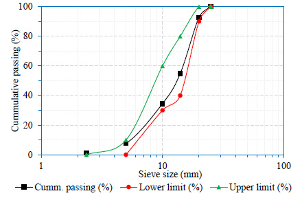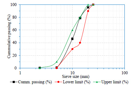 From Figs. (2 and 3), the coarse aggregates were well graded, which is within the grading envelope as provided in BS 882 [46]. This meant that the coarse aggregates used in concrete for this investigation met the necessary criteria and could thus be utilized to produce concrete for the research without the need for blending. The particle size distribution of RCA is similar to the sieve curve of natural coarse aggregate, with little variation.