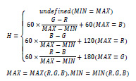 This irradiation was extracted from the RGB image and the HSV color space was used. The hue (H) in the HSV color space represented the colors in the hue ring, ranging from 0 to 360°. The RGB color space of the RGB image was converted into the HSV color space, as shown in Fig. (8).