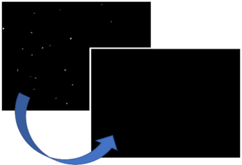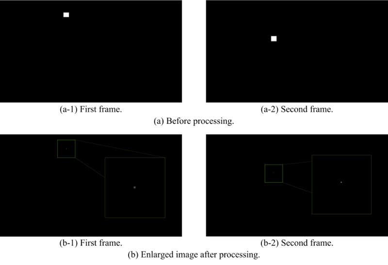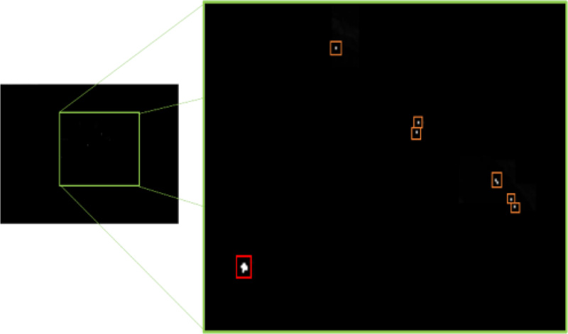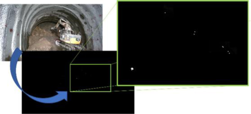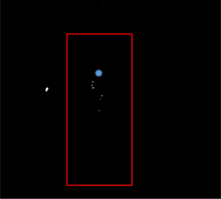 For the extracted image of the moving objects on the tunnel face mentioned in 2.1.1, the range (red frame) wherein the excavated soil was to be removed as specified, based on the coordinates of the excavation point (blue point) estimated in 2.1.2, as shown in Fig. (10). By removing pixels in the specified range, only the rockfalls were detected, as shown in Fig. (11).